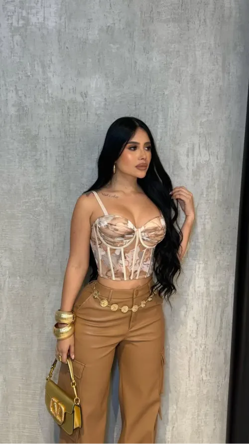 🖤 Falda de malla transparente con short interno y cinturón dorado XL. Combinado con crop top blanco para un look de pasarela.
