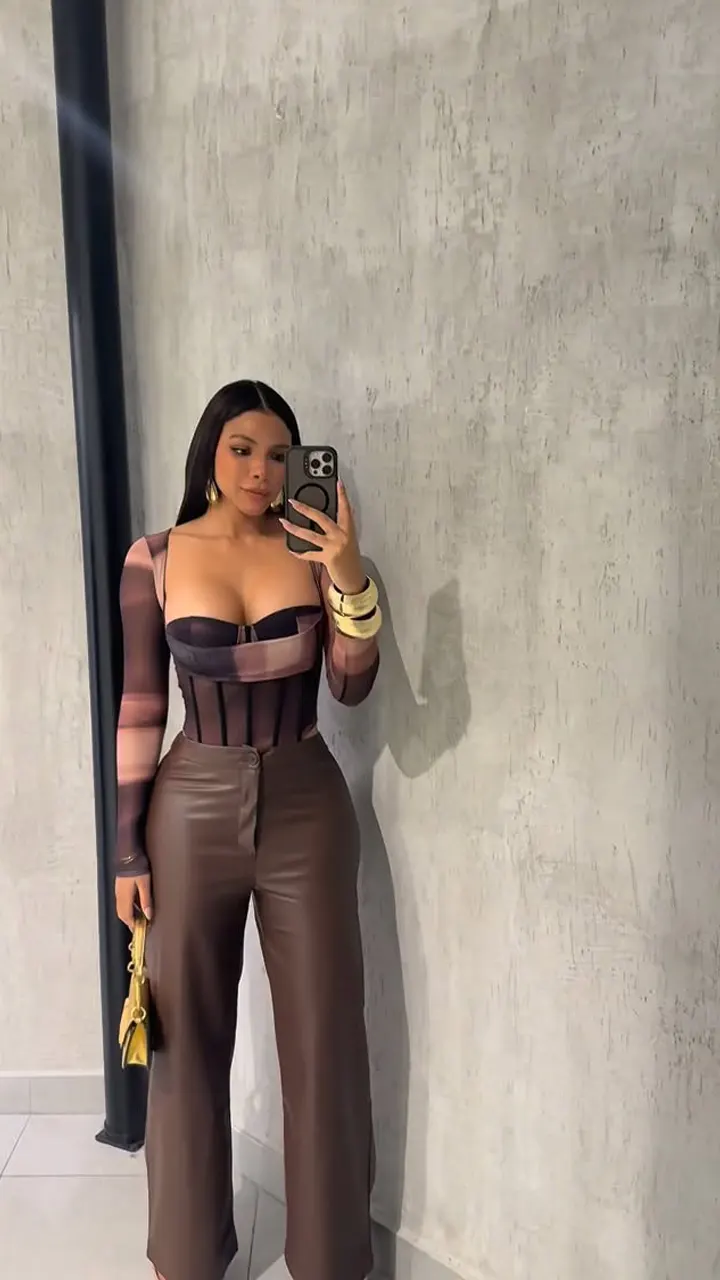 ☕ Body de malla con transparencias en tonos chocolate y pantalón de cuero suave. Look audaz, moderno y muy fashionista.