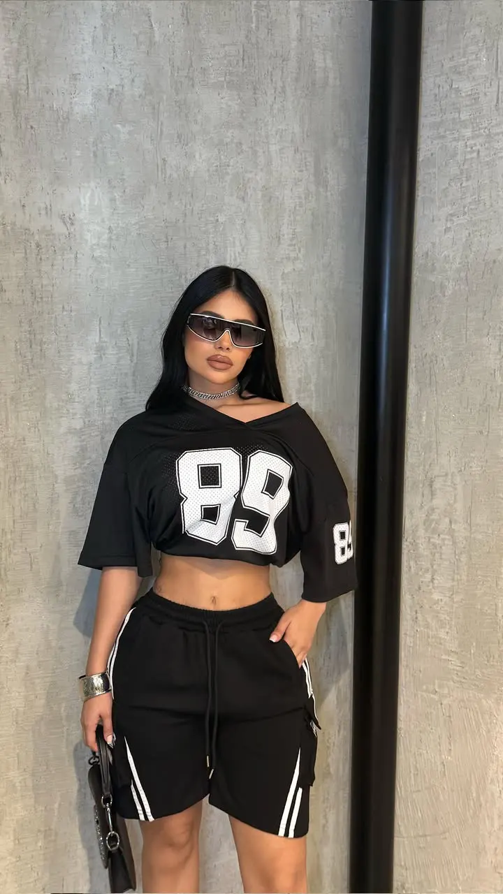 🖤 Conjunto deportivo negro con top tipo jersey “89” y shorts con líneas blancas. Atemporal, cómodo y con una vibra street glam perfecta para marcar estilo sin perder frescura. Ideal para días activos, eventos casuales o sesiones urbanas con flow.